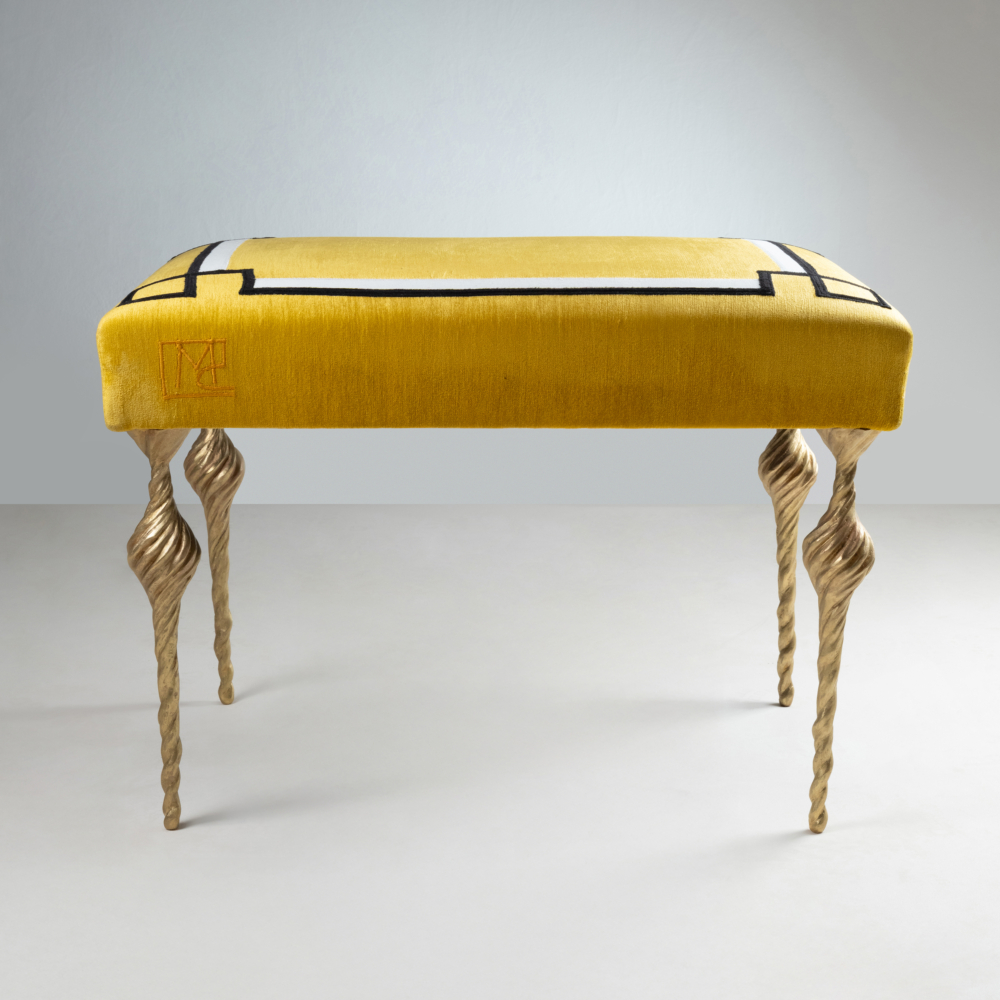 Banquette Arabesque avec piètement en bronze patiné doré et assise recouverte de broderies réalisées à la main par Miguel Cisterna