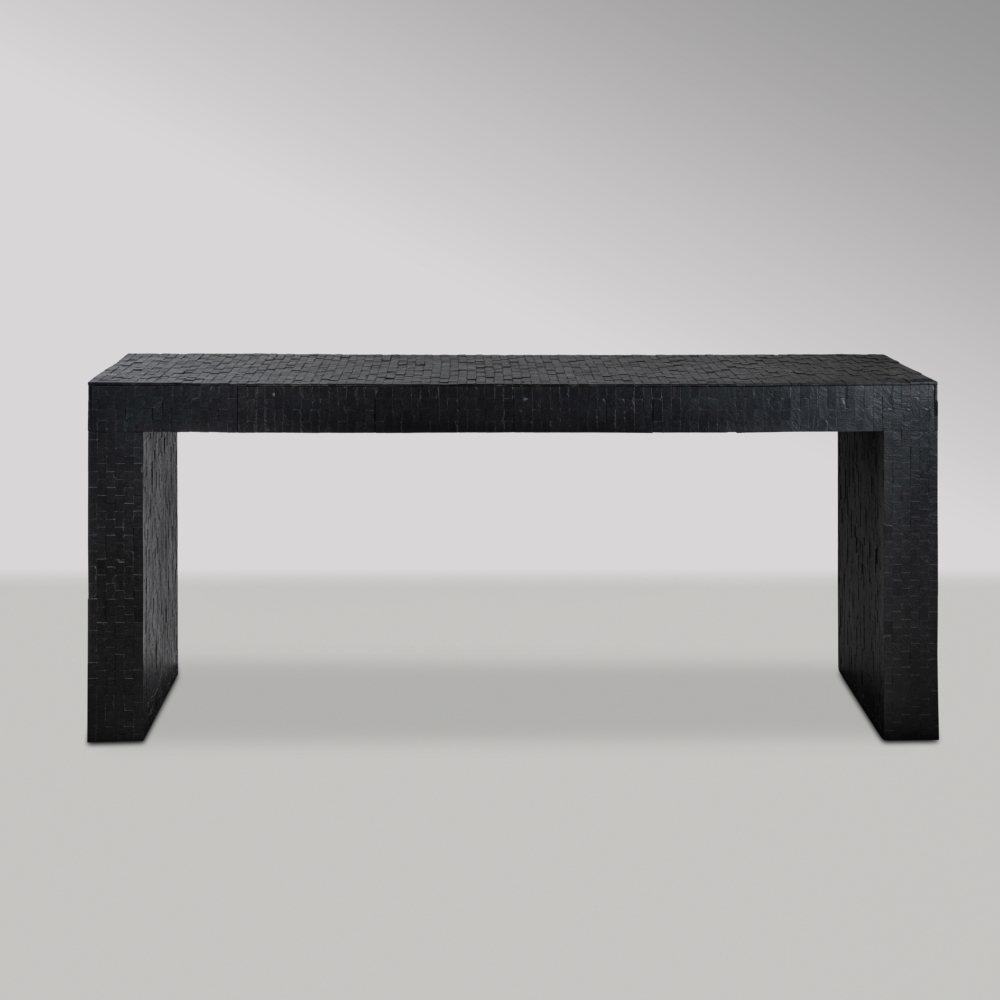 Structure en bois recouverte d’une marqueterie d’ardoises, deux tiroirs en façade.