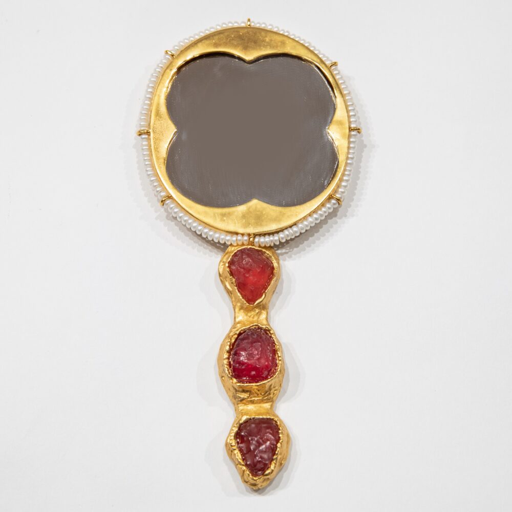 Bronze doré, cabochons en pâte de verre rouge et perles blanches Signé au dos « Paris, Robert du Marais »