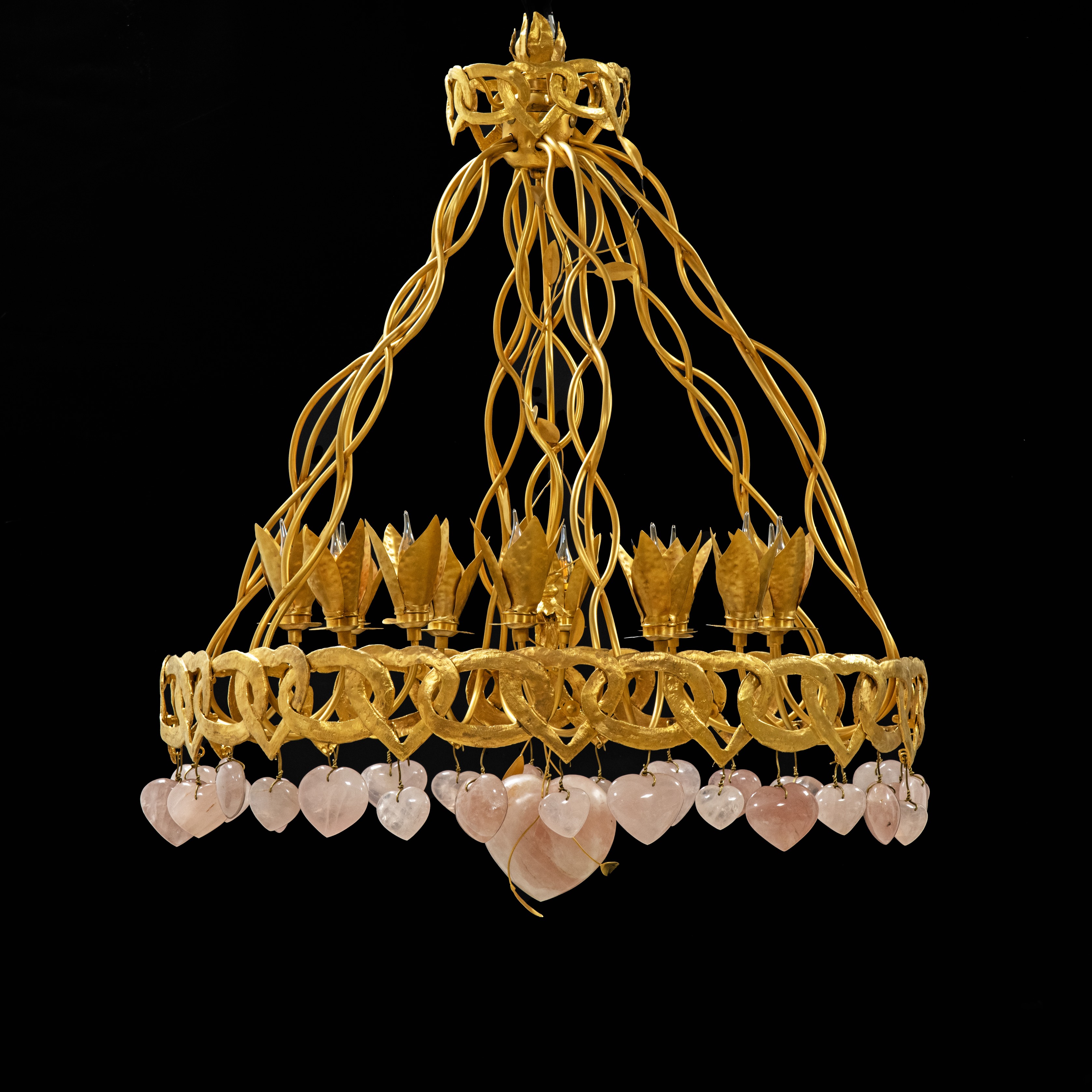Lustre en bronze doré et quartz rose Composé de 12 lumières, de 30 coeurs sur la couronne et d’un coeur central