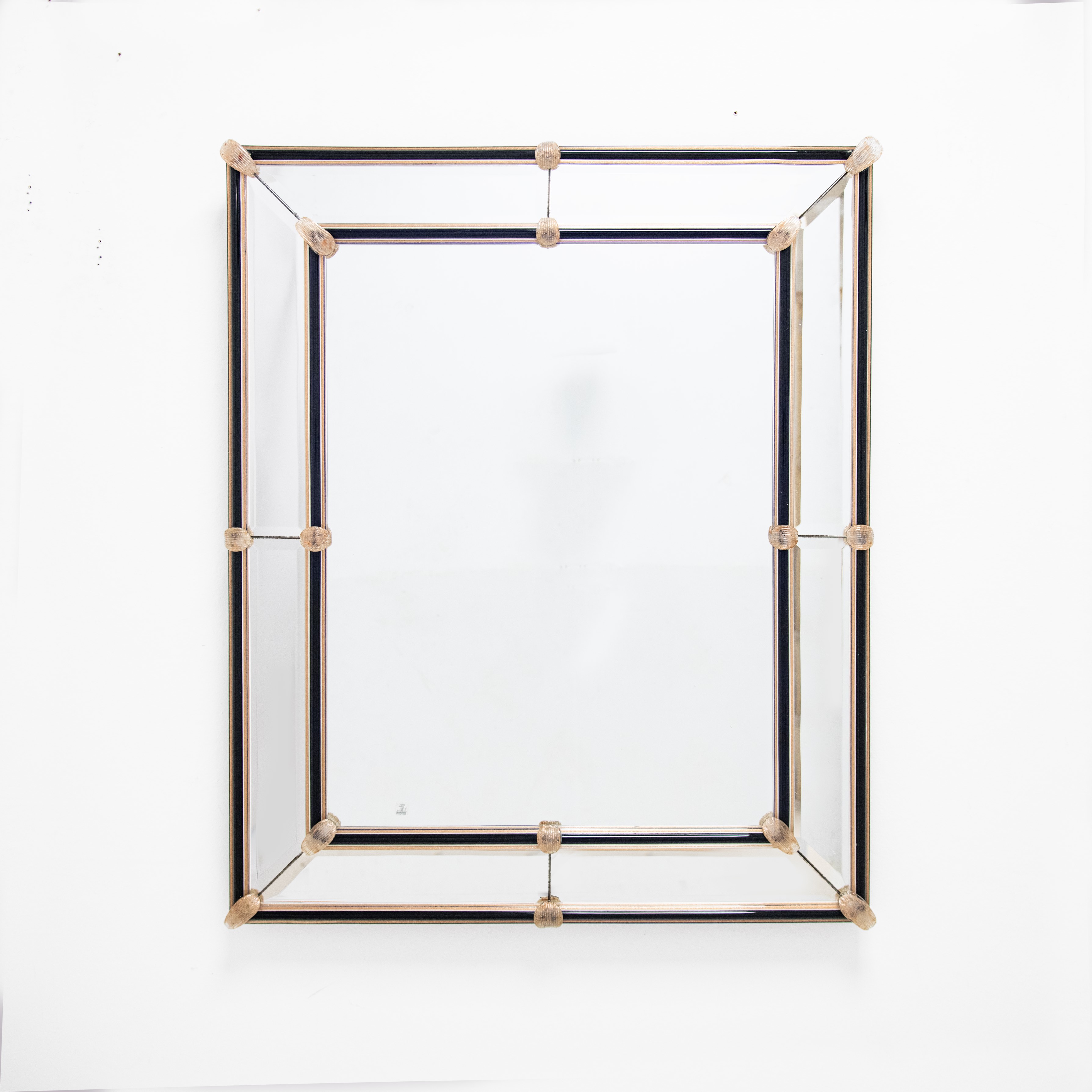 Miroir de Murano en verre miroitant, baguettes et pétales de verre violet et doré Etiquette de la verrerie