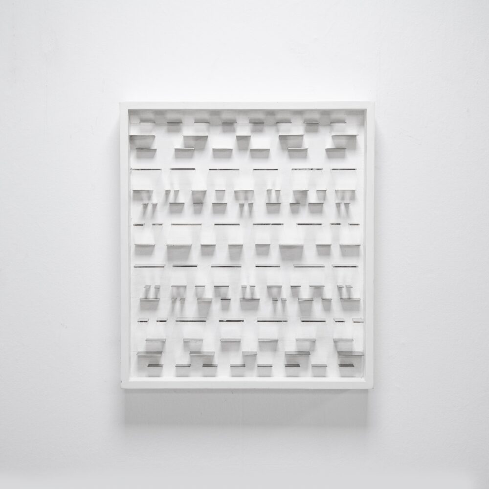 Inclusion de lames d’acier et lames de plexiglas sur bois peint blanc Signé et daté Pièce unique