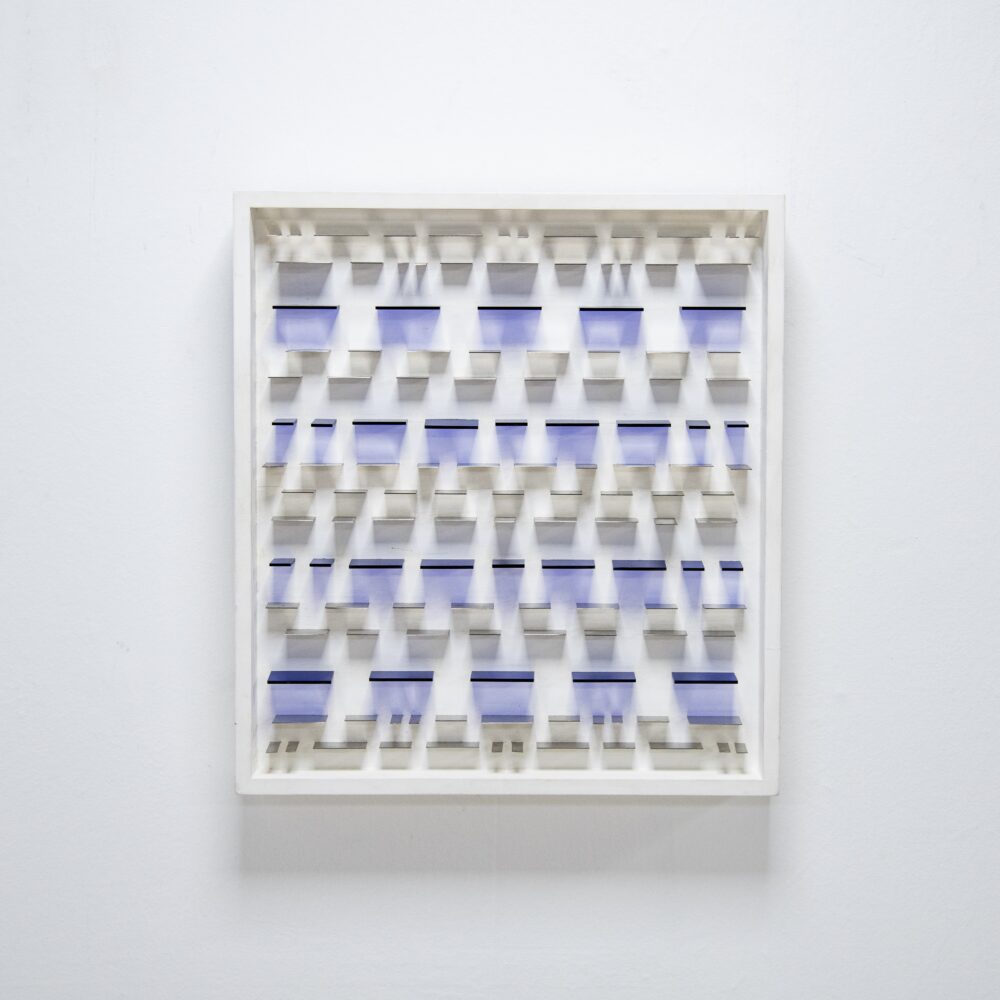 Sans titre Lames d’acier et lames de plexiglas coloré sur bois peint Signé et daté Pièce unique