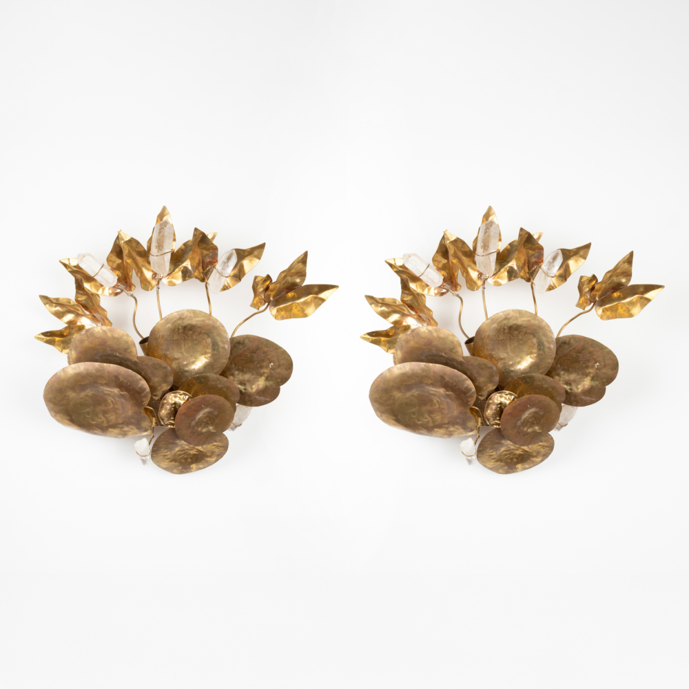 Paire d’appliques en bronze doré martelé imitant des nénuphras et des feuilles avec des ornements en cristal de roche