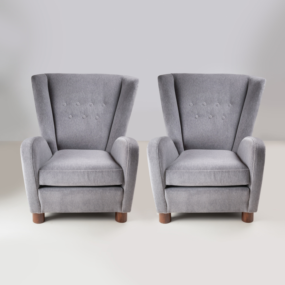 Paire de fauteuils recouverts de velours gris, piètement bois