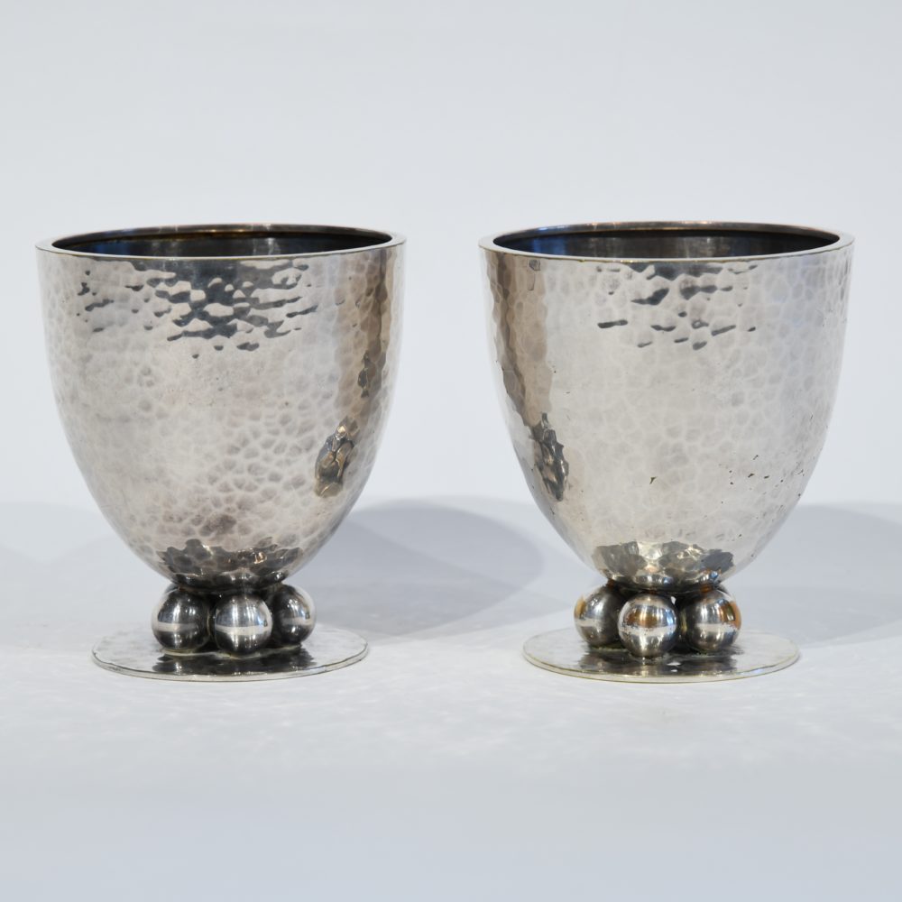 Paire de timbales en métal argenté martelé sur une base à motif de sphères Signées en dessous