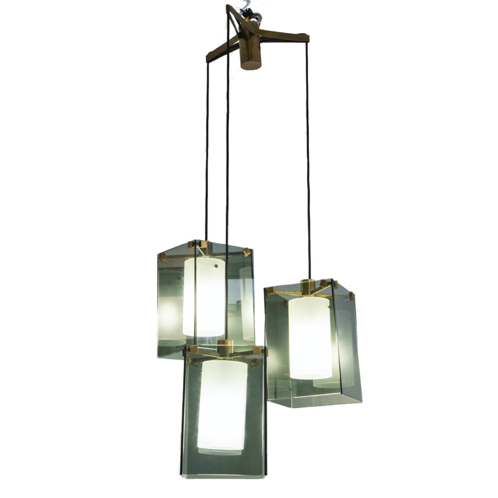 Suspension composée de trois lumières en verre teinté et opaline pour Fontana Arte Hauteur totale : 125 cm