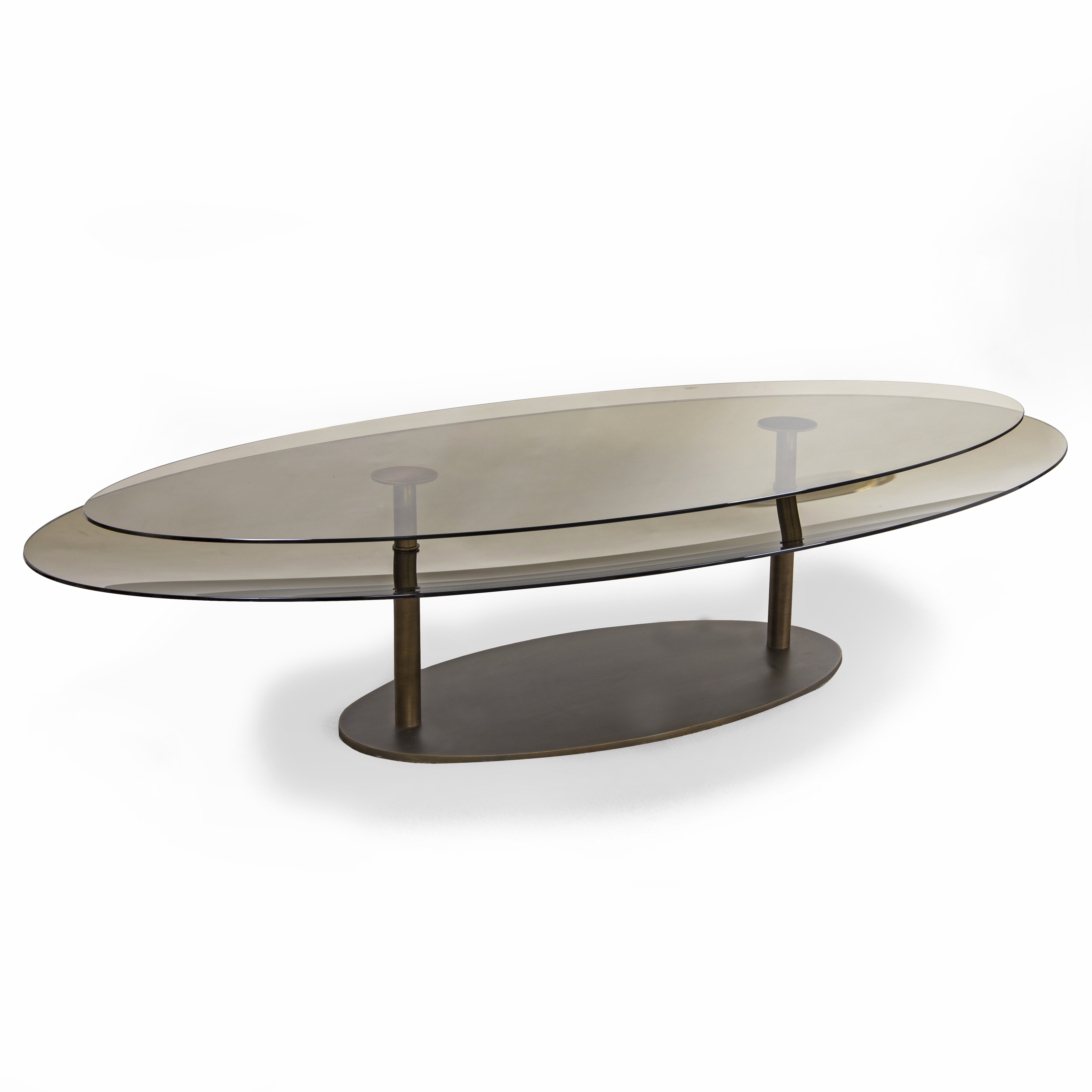 Double plateau en verre teinté sur une structure en laiton patiné Pièce unique