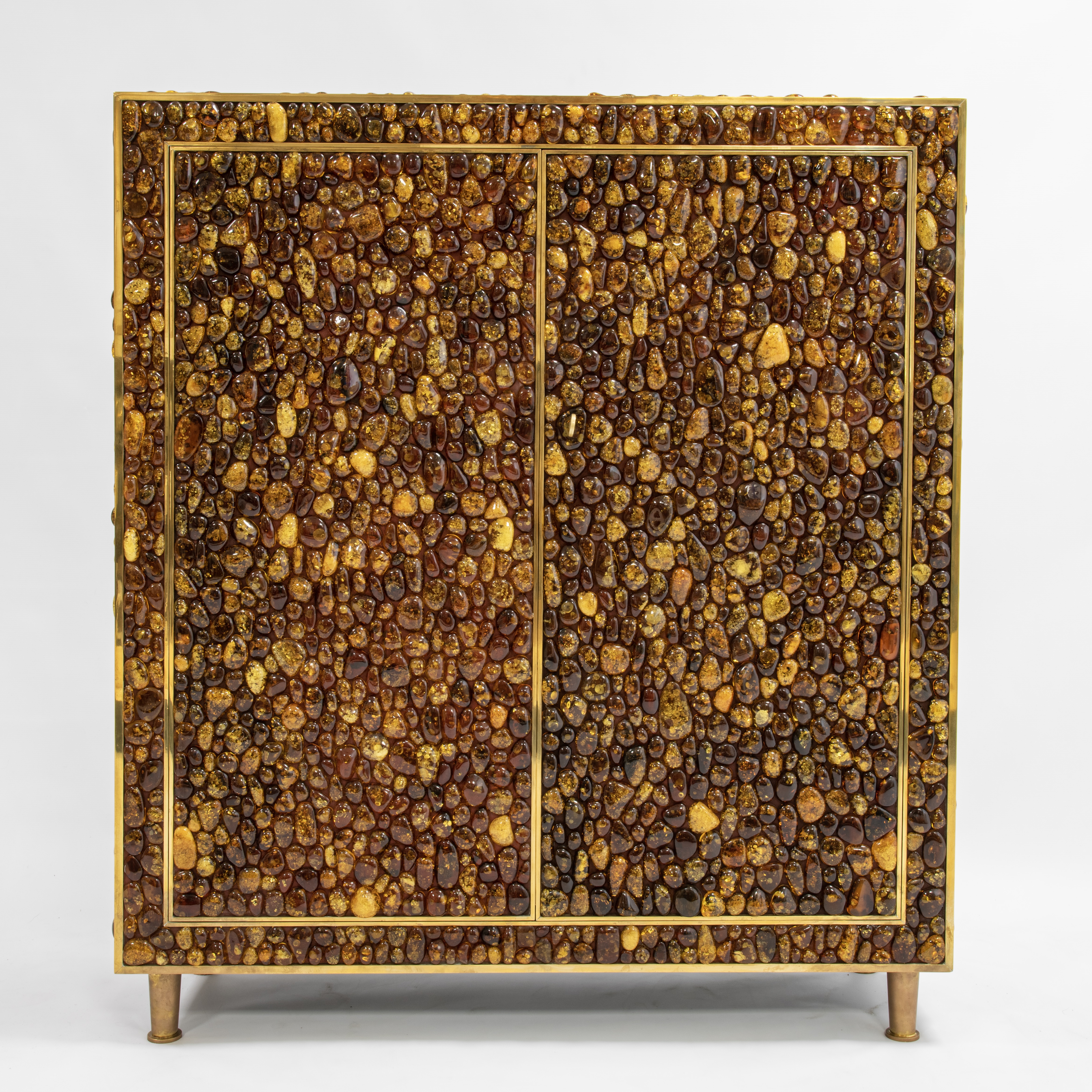 Wooden structure covered with amber cabochons, polished brass and bronze