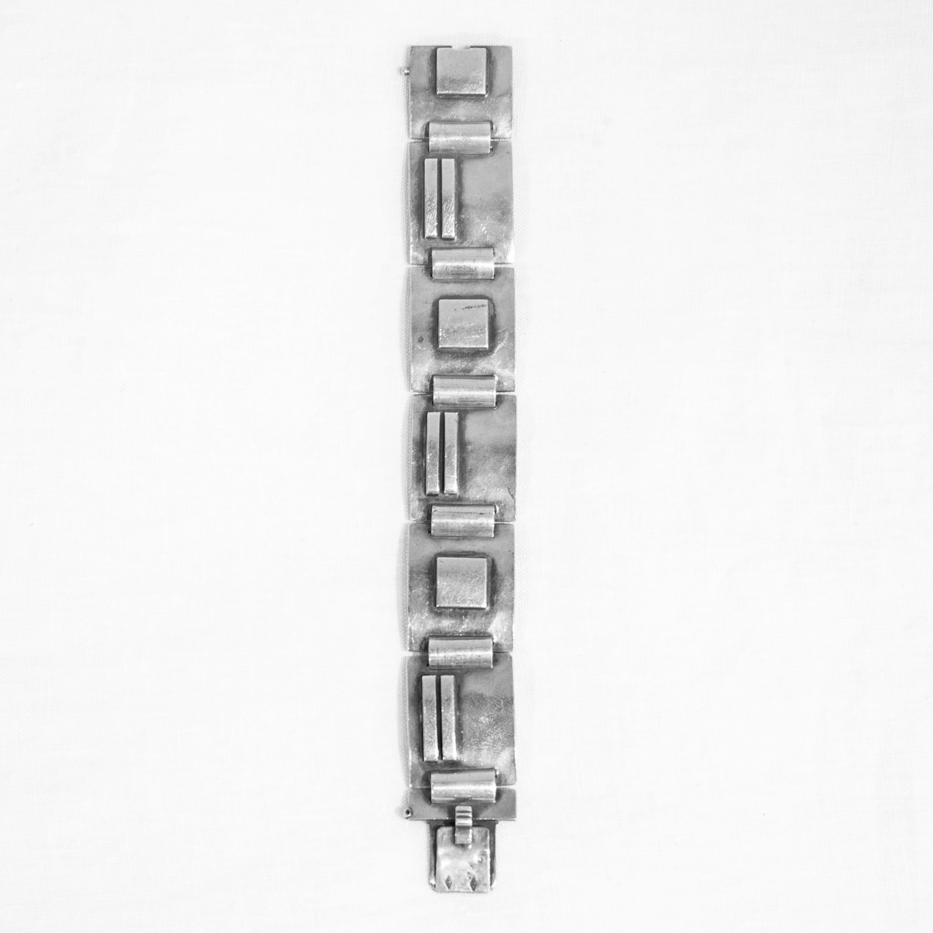 Solid silver bracelet with geometrical patterns Signature. Maker’s hallmark. Silver hallmark.