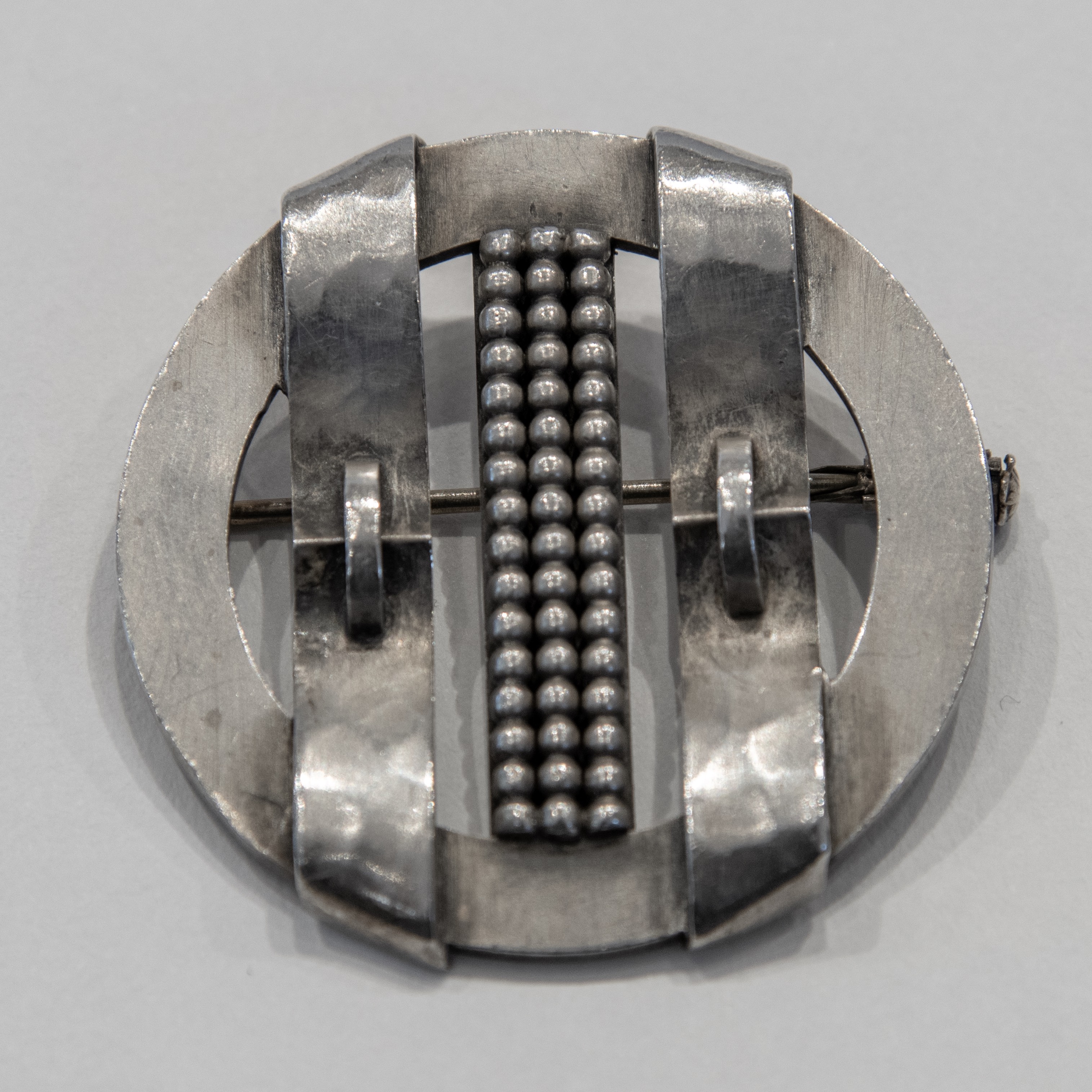 Circular brooch with ribbon and pearl motifs. Signed. Maker’s mark. Silver hallmark.