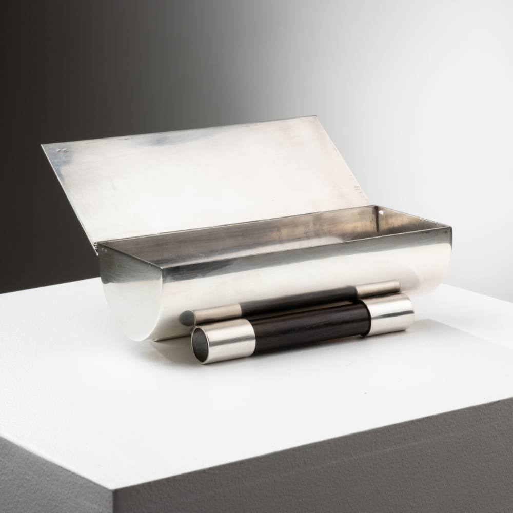 Silver cigar box, sleeve and base in silver and ebony wood. Attr. to Julia Keilowa Silver Hallmark.