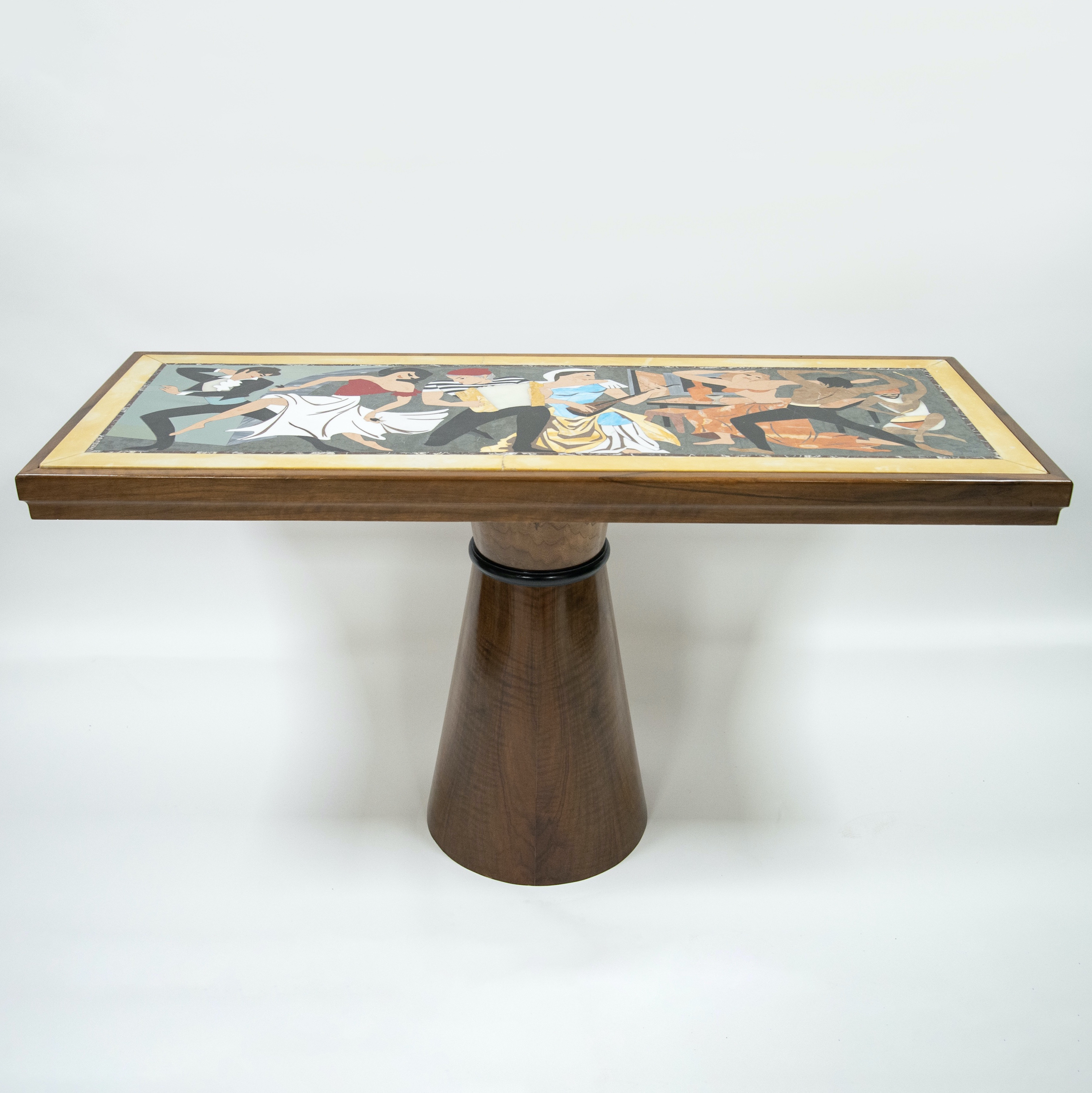Rare wooden console, rectangular top made with “pietra dura” marble making a dance scene
