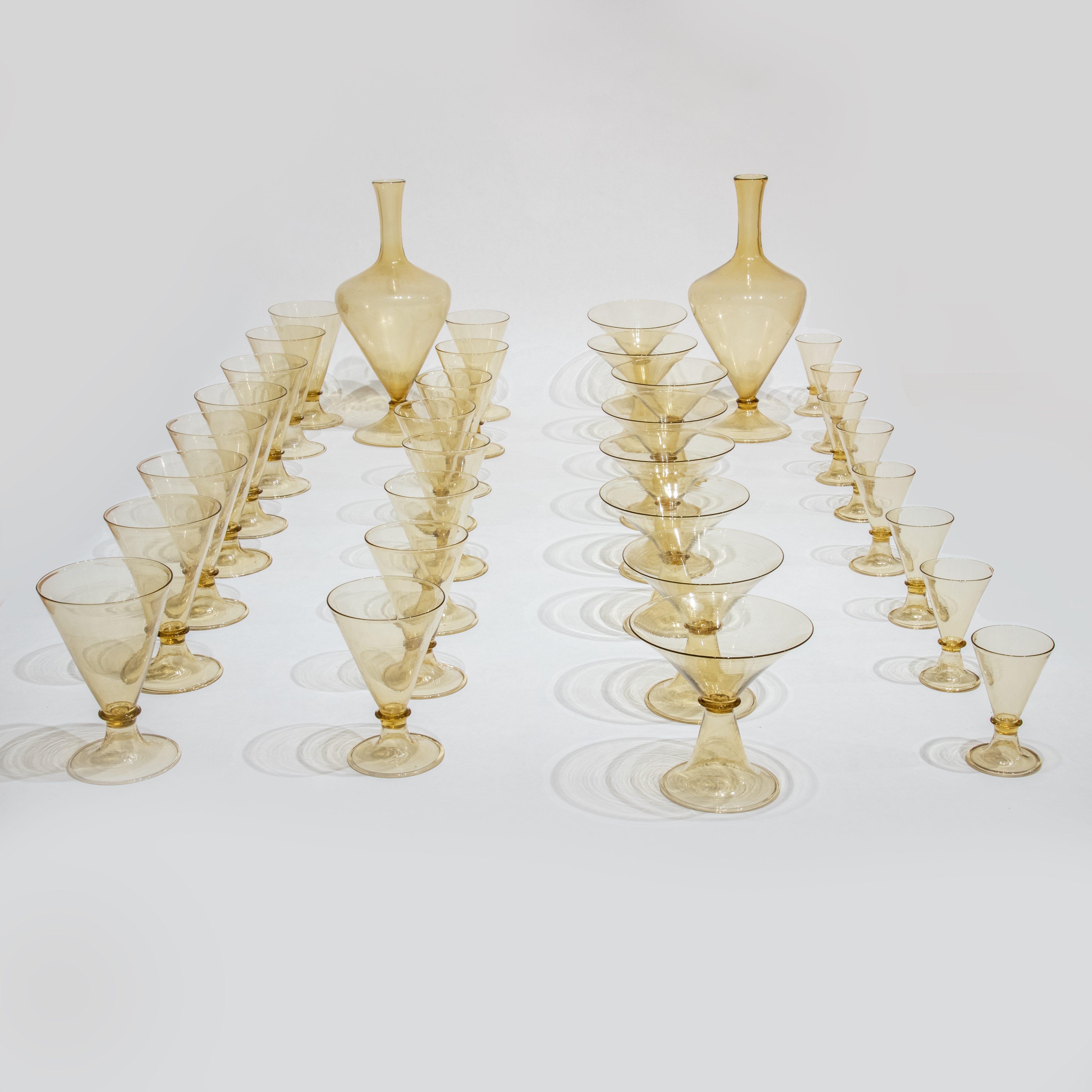 Set of 32 glasses and 2 blown straw-colored glass bottles with a truncated conical foot.