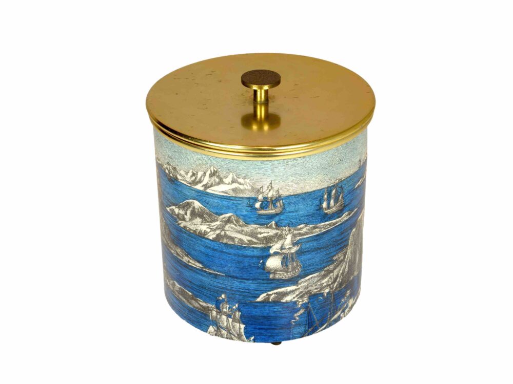 Ice bucket with screen printed metal sailboats and icebergs patterns, gilded cover Signed “Fornasetti Milano made in Italy”