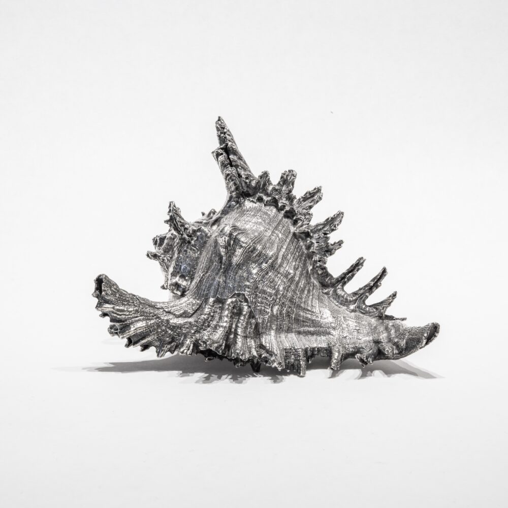 Large shell mounted on a gold-leaf gilded resin base, set with cabochons of semi-precious stones, cultured pearls and Swarovski crystals. Signed and dated.