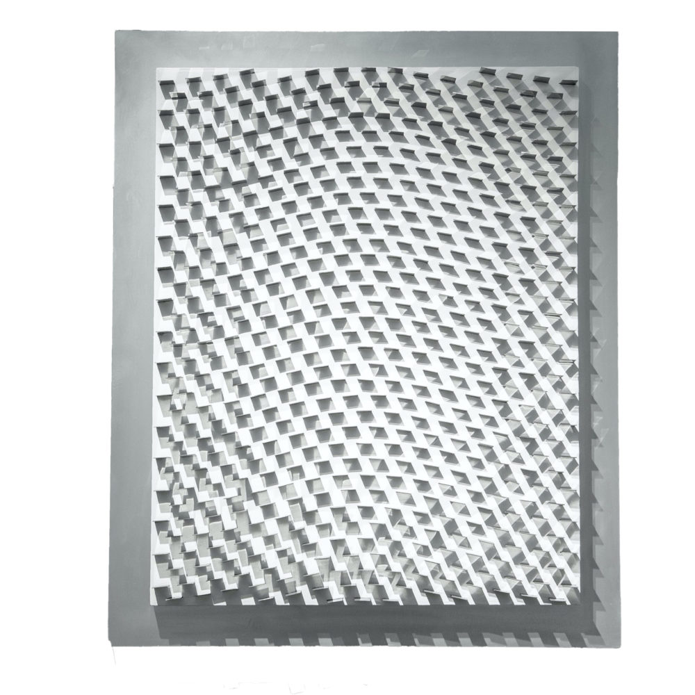 Untitled Steel blades on white painted wooden panel Unique piece Signed and dated “Cavell 72”