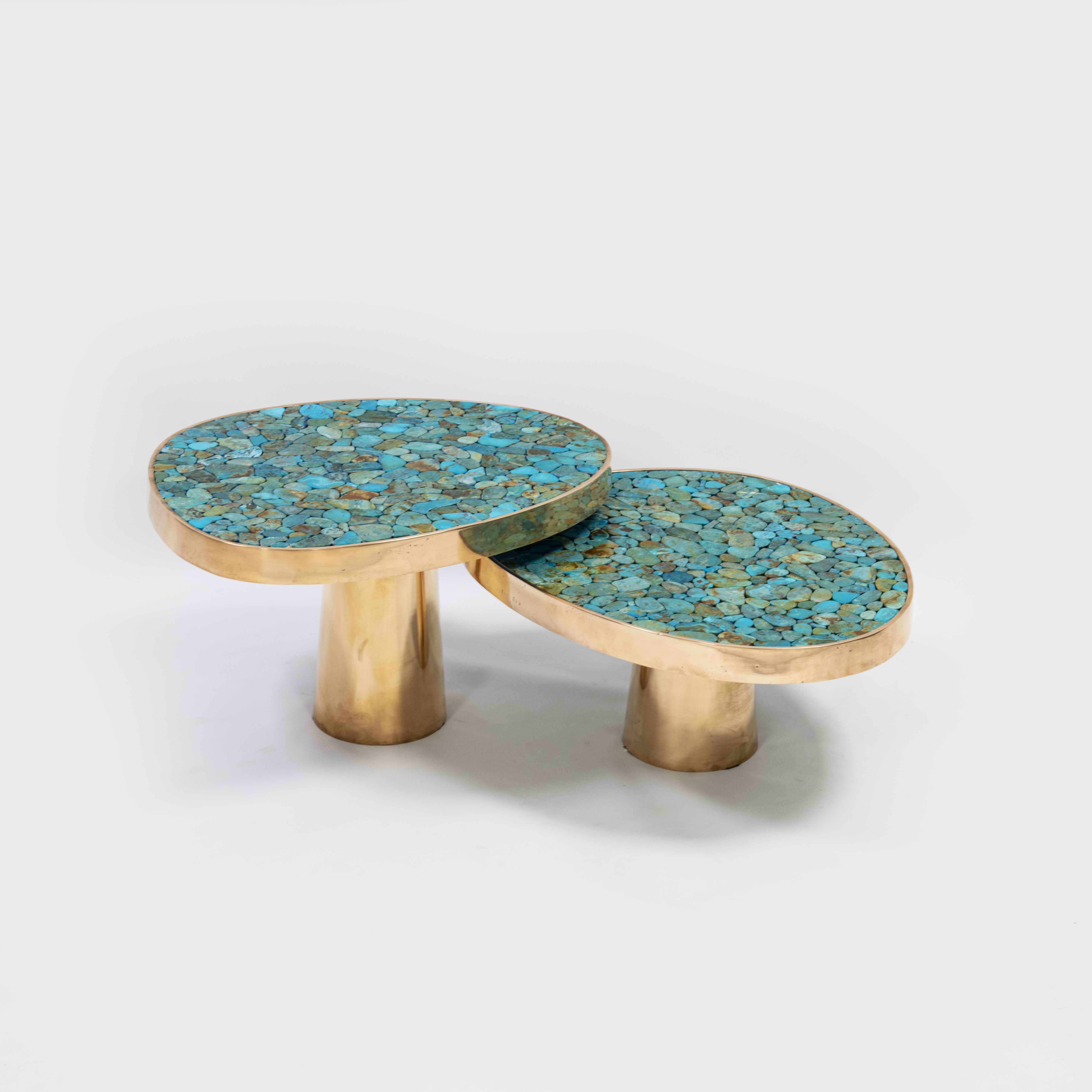Turquoise mosaic top on a bronze and polished brass structure Limited edition of 25 for each size, signed and numbered H 35 or 27 cm / H 13.78 or 10.63 inches
