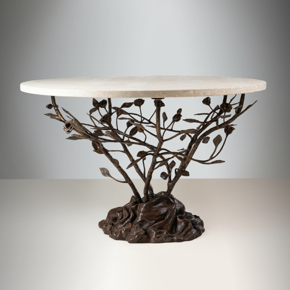 “Rosier” pedestal table in patinated bronze with a Grigio Alpi top