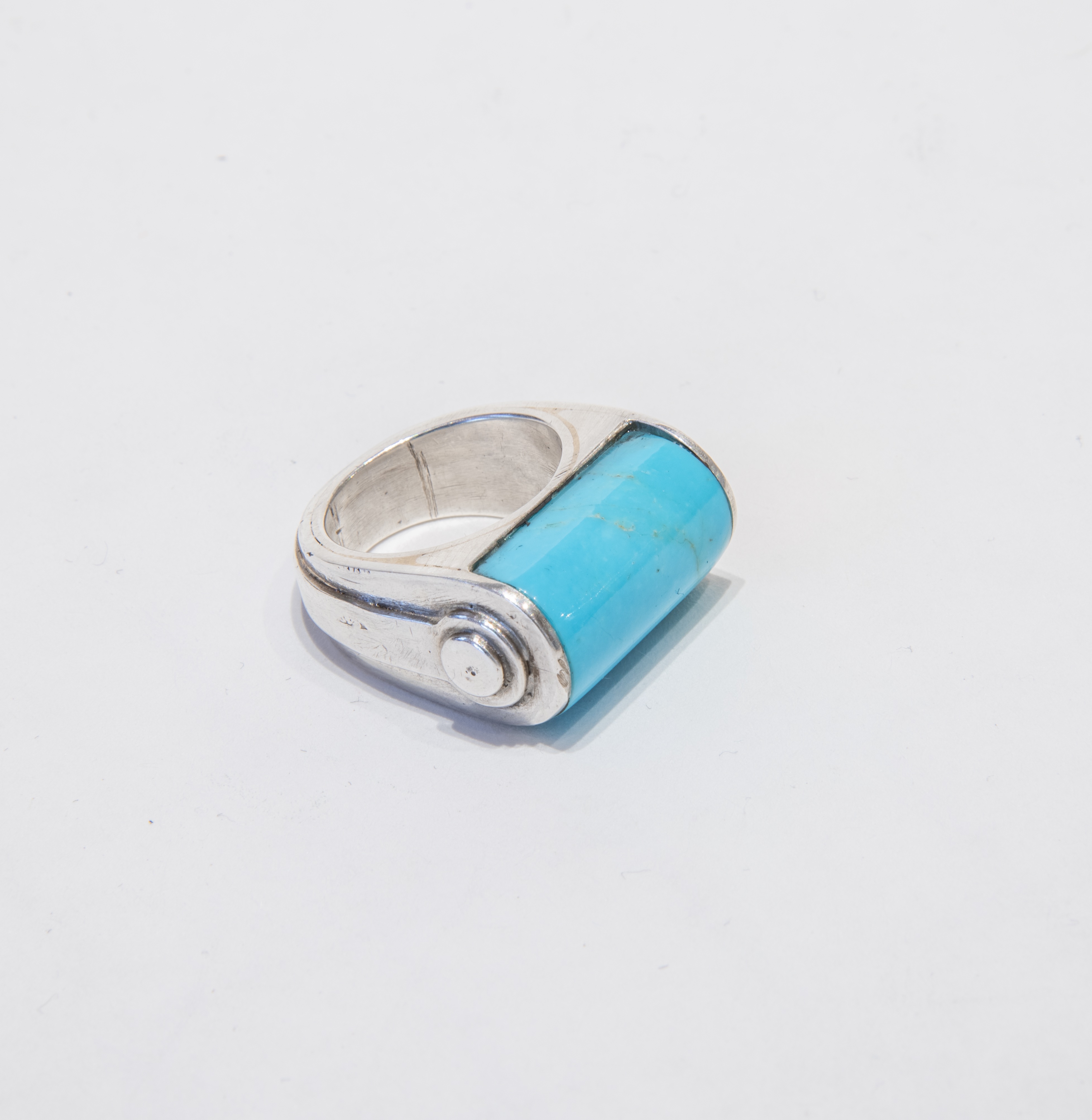 Silver ring and cylindrical turquoise ring head Maker’s hallmark. Silver hallmark. Size US 8 : Size FR 57 Ring head : W 2.5 x D 1.3 cm / W 0.98 x D 0.51 inch