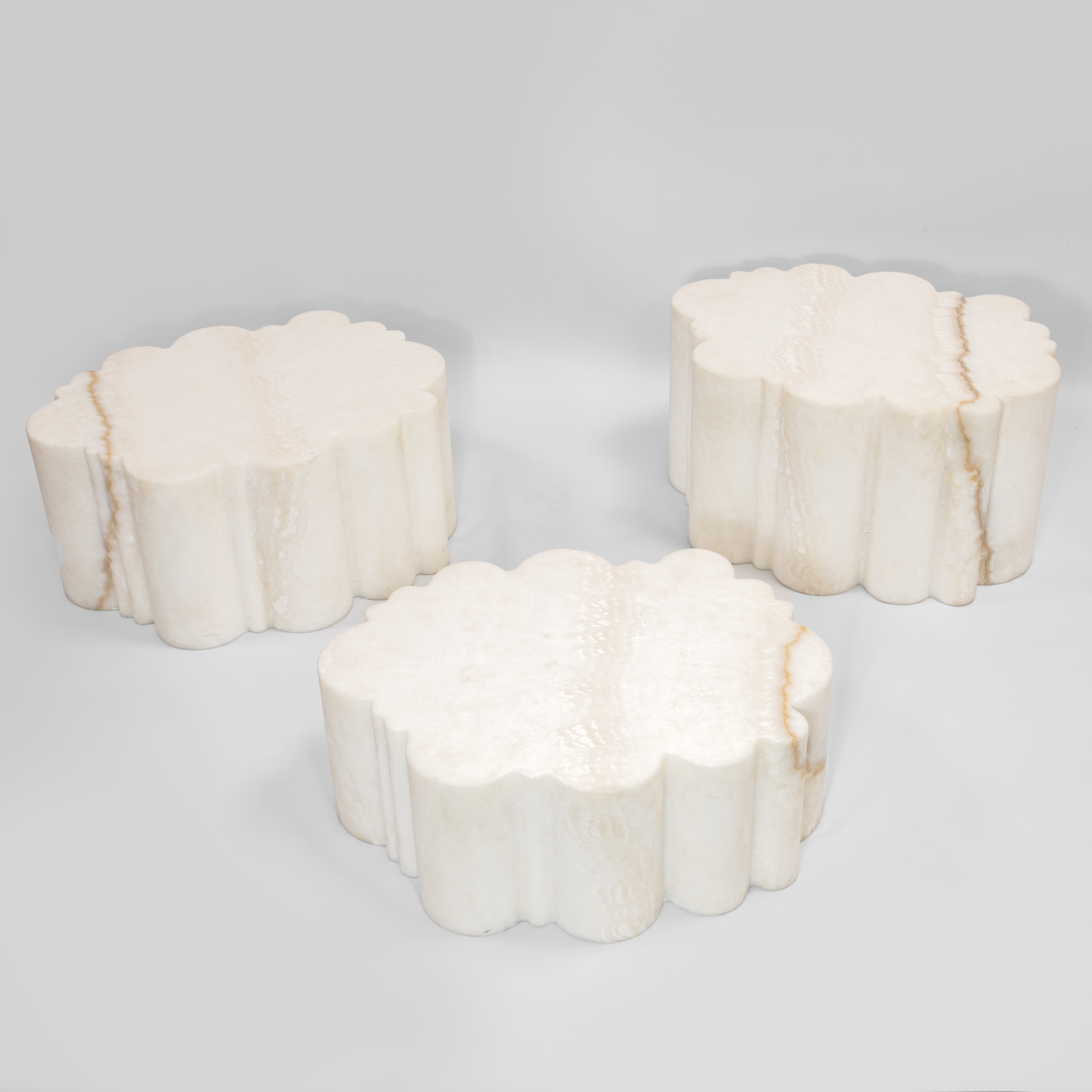 Three Cloud tables made with polished ivory onyx Each table is unique Signed “KAM TIN & Margraf” Available in three heights: H 26 / 32 / 36 cm – H 10.24 / 12.6 / 14.17 inches The tables can be sold separately