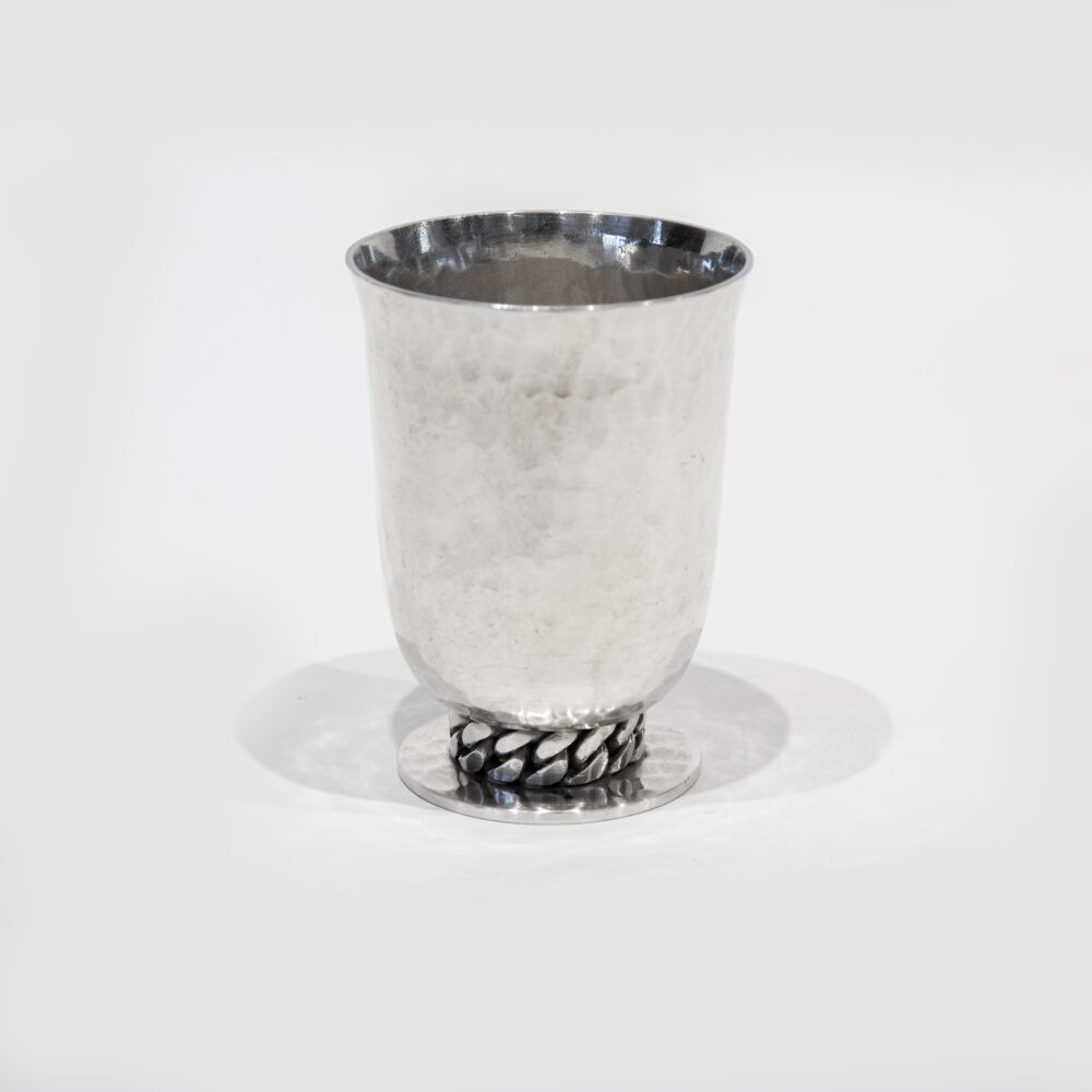 Hammered silvered metal timbale on a chain pattern base Signed underneath