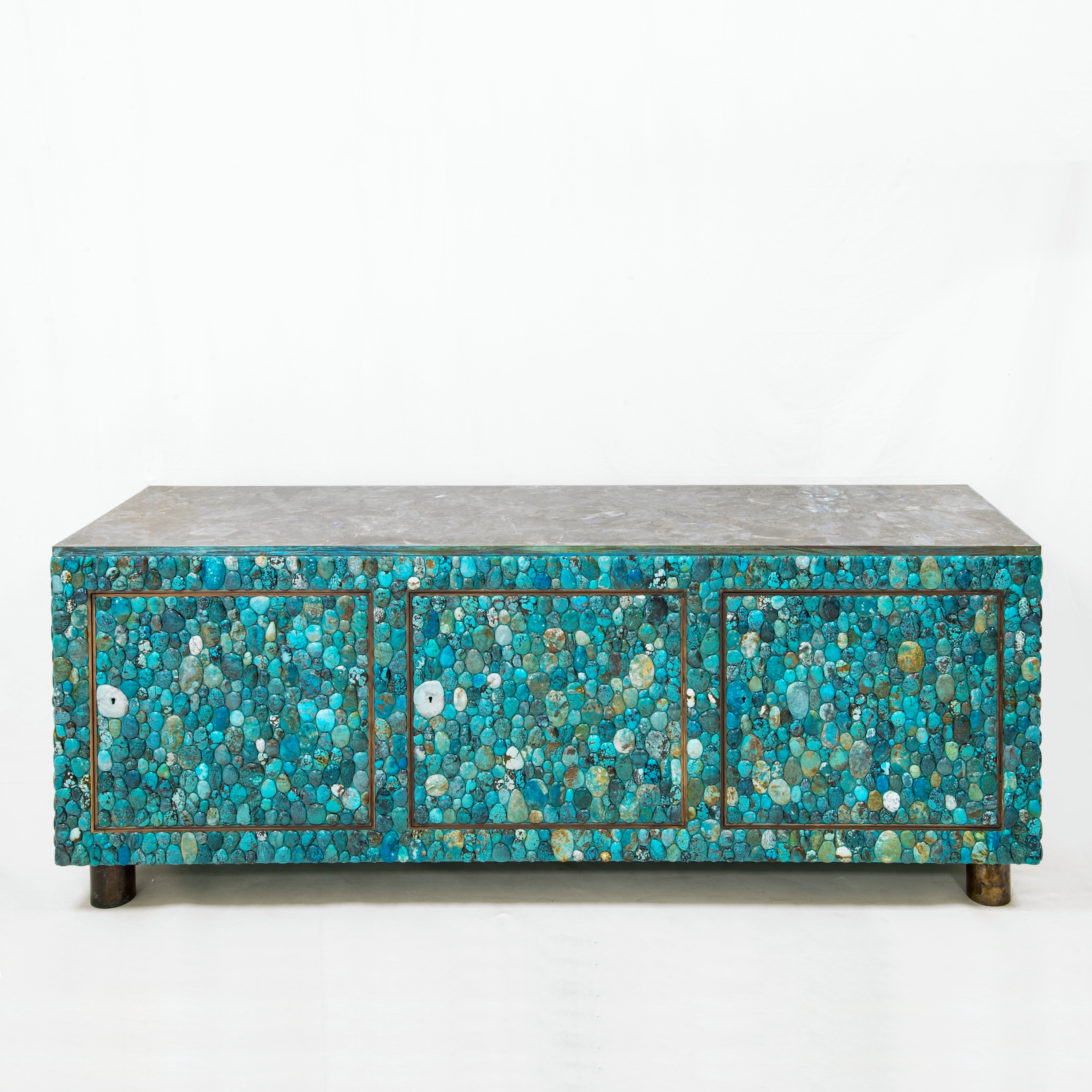Wooden structure covered with turquoise cabochons, labradorite top, patinated brass legs and finish Three front doors, signed “K” on the key Unique piece