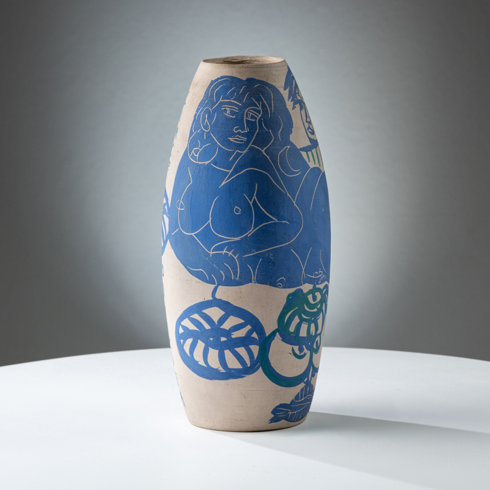 Ceramic vase with blue figurative ornaments